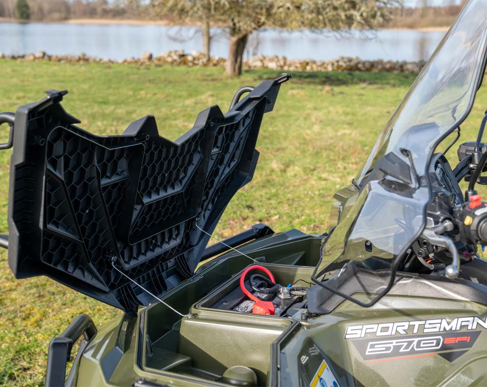 Prise électrique 12 volts, port de charge lente intégré, pré-câblé pour chauffe-mains et chauffe-pouces, système de sécurité activé par code PIN, Protections avant et arrière des bras triangulaires, rallonge de porte-bagages avant, rails métalliques pour benne